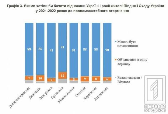 На Харківщині лише 16% були не проти такого варіанту розвитку подій, а 66% – категорично проти. У Херсонській області 4% бажали приєднання до країни-агрессорки (проти були – 85%), у Запорізькій області – 6% (проти – 82%), Дніпропетровській 7% проти 88%. У КМІС також об’єднали результати опитувань лютого 2021 року, листопада 2021 року та початку лютого 2022 року, щоб мати репрезентативну вибірку настроїв мешканців окремих областей. Цього разу вдалося опитати людей лише на підконтрольних територіях Донецької та Луганської областей, тоді як минулого разу думки дізнавалися на всій території. Отже, згідно зі зведеними опитуваннями на півдні і сході нашої держави абсолютна більшість населення висловлювалась проти приходу росії на їх землі. У Донецькій області лише 10% хотіли б об’єднатися з рф, тоді як 86% підтримують незалежну Україну. Така ж ситуація й на Луганщині. За підсумками опитувань 2021-2022 років створили регресійну модель для перерахунку даних про бажання об’єднання України з рф в відсоток тих, хто хотів би, щоб до росії приєдналася його область, адже прямого запитання про об’єднання України з рф не було. Таким чином, на Донеччині 81% населення проти приєднання до рф, на Луганщині 78%, у Харківській області – 85%, Запорізькій – 88%, Херсонській – 89%, на Дніпропетровщині – 87%. «Проведення референдумів на захоплених росією українських територіях є незаконним і порушує міжнародні норми. Крім того, приєднати таким чином території до росії можливо лише фальсифікуванням результатів референдумів. Дані численних опитувань показують, що при будь-яких прозоро та чесно організованих опитуваннях, плебісцитах чи референдумах абсолютна більшість населення кожного з регіонів півдня і сходу висловилися б за незалежність України і належність своєї області до України», - підсумували у КМІС.