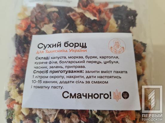 Активні мешканці Кривого Рогу готують сухі заготовки для борщу, аби потім відправити військовим на фронт, які знаходяться в польових умовах. Армійці для приготування страви мають запарити її окропом та додати томатну пасту. За трохи більше ніж два місяці волонтери виготовили 1000 пакетів зі стравою – це 2000 порцій.