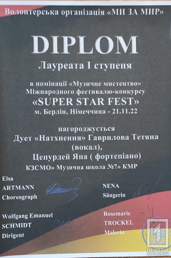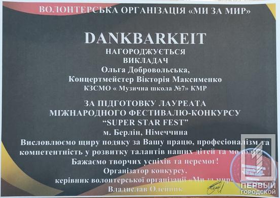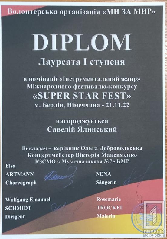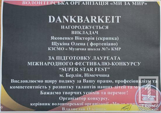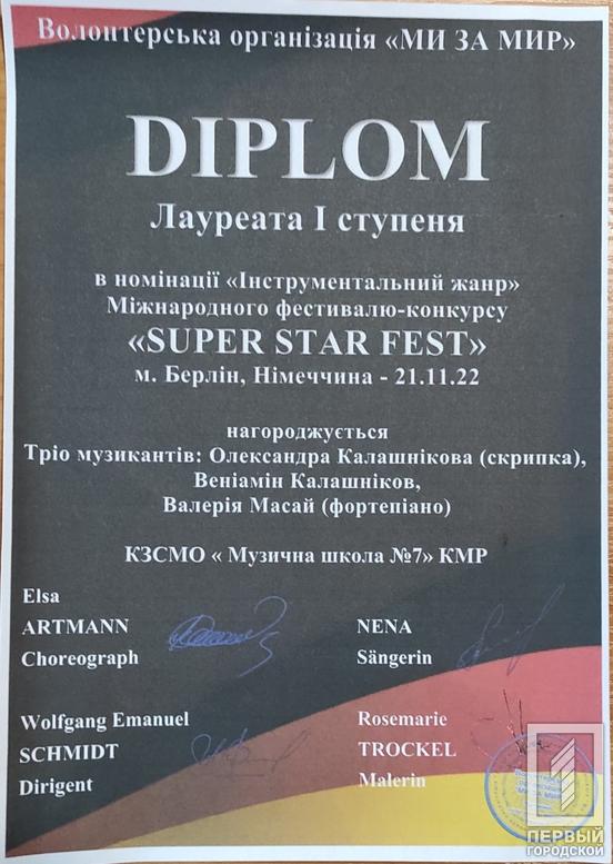 Крім того, 21 листопада провели Міжнародний фестиваль - конкурс Super star fest, на якому за перемогу змагались юні таланти з різних куточків державу у Берліні. Долучились до фестивалю й вихованці Криворізької музичної школи №7. Відповідно до результатів, юні мешканці нашого міста стали переможцями. Зокрема, лауреатами І премії стали: Савелій Ялинський (скрипка, викладач Добровольська О. Л., концертмейстер Максименко В.В.); дует «Натхнення» Гаврилова Т. Г. (вокал), Цепурдей Я. О. (фортепіано); тріо музикантів ‒ Олександра Калашнікова (скрипка), Веніамін Калашніков та Валерія Масай (фортепіано).