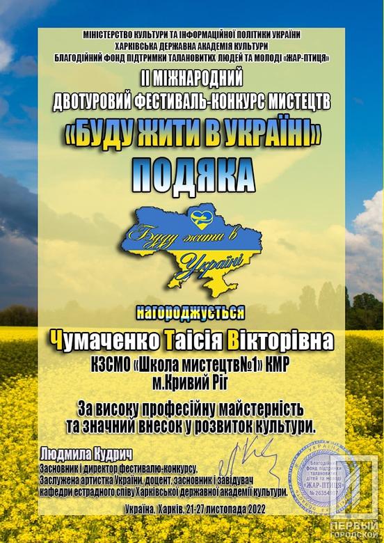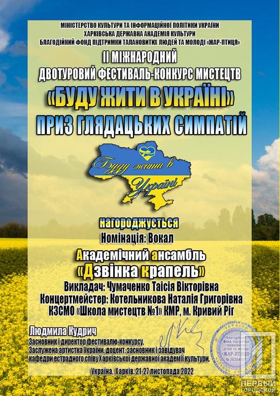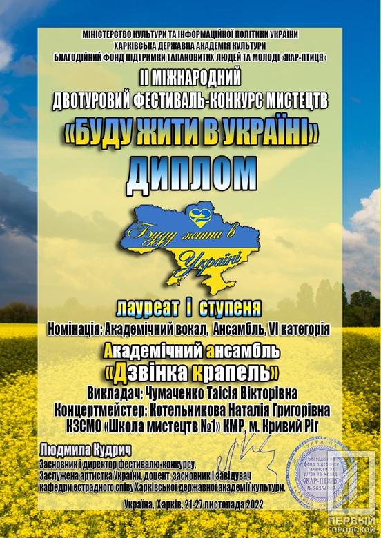 Крім того, з 21 по 27 листопада тривав II Міжнародний двотуровий фестиваль мистецтв «Буду жити в Україні». Творчі змагання провели в Харкові за підтримки Міністерства культури та інформаційної політики України. За переможні місця у конкурсі позмагались і вихованці криворізької школи мистецтв №1. Криворіжці у складі вокального ансамблю «Дзвінка крапель» посіли почесне І місце й отримали приз глядацьких симпатій. Керівником є Таїсія Чумаченко, а концертмейстером Наталія Котельникова.