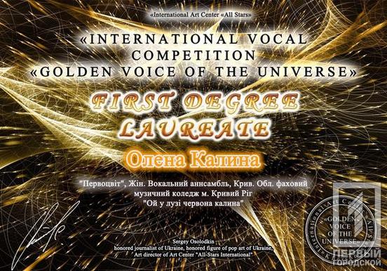 30 листопада стало відомо про те, що жіночий вокальний ансамбль «Первоцвіт» Криворізького обласного фахового музичного коледжу брав участь у II Міжнародному конкурсі «Золотий голос Всесвіту». Колектив з Кривого Рогу здобув переможні нагороди.
