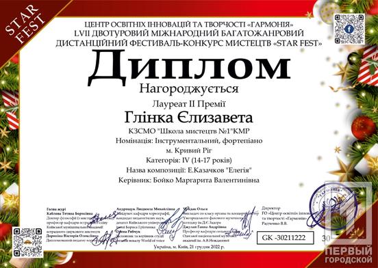 Попри війну, юні криворіжці продовжують приймати участь у різноманітних змаганнях та гідно представляти нашу країну та місто на міжнародних аренах. У Міжнародному фестивалі-конкурсі мистецтв «STAR FEST», який проходив 21 грудня у Києві, посіли переможні місця талановиті учні фортепіанного та оркестрового відділу Криворізької школи мистецтв №1, зокрема: