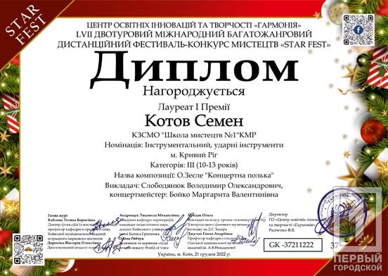 21 грудня у Києві відбувся LVII двотуровий Міжнародний багатожанровий дистанційний фестиваль-конкурс мистецтв «STAR FEST». Вихованці Криворізької школи мистецтв №1 показали блискучий результат, посівши перші та другі місця з гри на фортепіано й ударних інструментах. Інформацію про це опублікували на сторінці закладу.