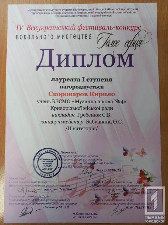 – дипломант – Ілля Гаркуша (викладачка І. Калюжна), Євген Чорнобривець (викладачка В. Данішевська). Нагадаємо, юні таланти з Кривого Рогу посіли призові місця у міжнародному музичному фестивалі.