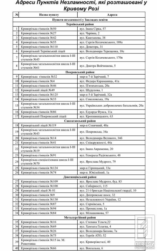 У Кривому Розі перші «Пункти незламності» були розгорнуті в освітніх закладах, й сьогодні на їх базі цілодобово працюють 52 такі зони допомоги мешканцям. Також, пункти працюють у комунальних закладах, відділеннях поліції, об’єктах бізнесу та промисловості. Начальник Військової адміністрації Олександр Вілкул провів виїзні робочі наради з питань оснащення, готовності та умов перебування городян у «Пунктах незламності», які розташовані в навчальних закладах міста.