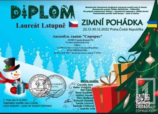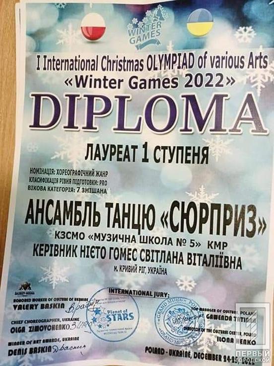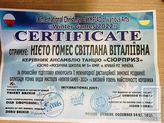 24-25 грудня провели Міжнародну зимову різдвяну олімпіаду мистецтв Winter games-2022, на якій за перемогу боролись юні таланти з різних куточків світу, зокрема й з Кривого Рогу. Взяли участь творчому змаганні учні криворізької музичної школи №5. За результатами ансамбль танцю «Сюрприз» став лауреатом І ступеню. Також юні талановиті криворіжці у складі ансамблю виступали на Міжнародному конкурсі мистецтв «Зимова казка». На фестивалі криворіжці також стали переможцями. Учні музичної школи №5 здобули одразу два перших місця. Керівницею ансамблю є Світлана Нієто Гомес.