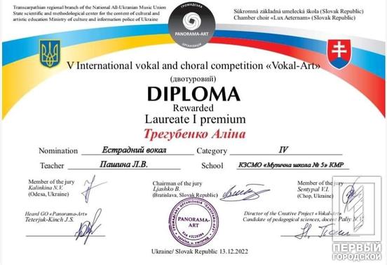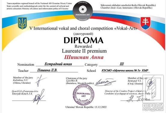 Крім того, чудово продемонстрували свої вміння й таланти учні вокально-теоретичного відділу. Юні криворіжці долучились до Міжнародного конкурсу вокального і хорового мистецтва Vokal-Art. Саме там вокалісти з різних країн боролись за перемогу відповідно до свого віку та жанру. Професійне журі високо оцінило криворіжців Аліну Тригубенко та Анну Шишман, які за результатами посіли І та ІІ місця відповідно. Творчою наставницею дівчат є Лариса Пашина.