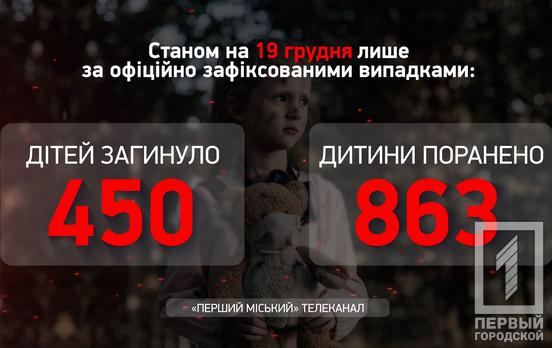 Станом на ранок 9 січня у нашій державі обірвалося життя 453 дітей в результаті збройної агресії рф. Ще 877 маленьких українців отримали поранення різного ступеня тяжкості з початку війни. Протягом минулого тижня загинула одна дитина, ще одна травмувалася. Найбільше постраждало маленьких громадян України в Донецькій області – 429, Харківській – 268, Київській – 117, Херсонській – 83, Миколаївській – 81, Запорізькій – 81, Чернігівській – 68, Луганській – 65, Дніпропетровській – 40.