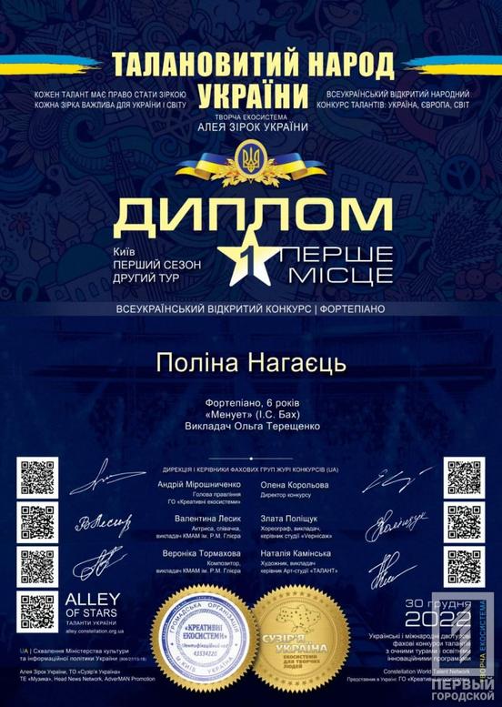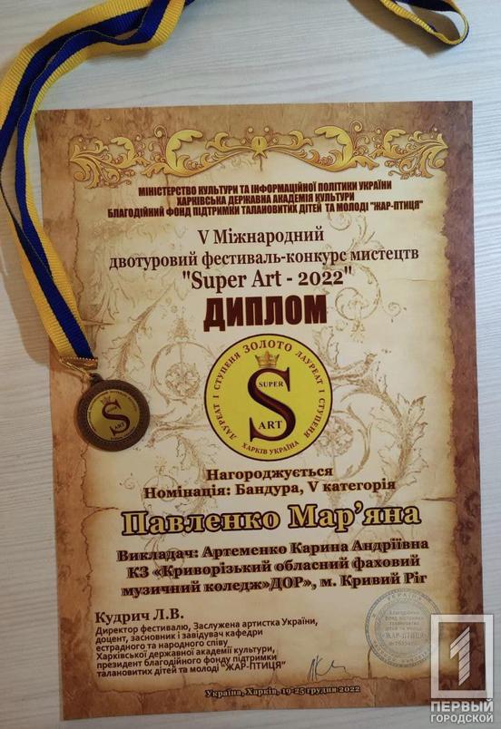 Крім того, відзначили й ученицю Криворізького обласного фахового музичного коледжу. Студентка ІІІ курсу спеціалізації «Народні інструменти» Мар’яна Павленко стала переможницею Міжнародного українсько-канадського конкурсу мистецтв «Шлях» і V Міжнародного двотурового фестивалю мистецтв Super Art-2022. Золото двох творчих змагань дівчина здобула під керівництвом Карини Артеменко.