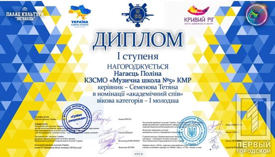 Взяли участь у творчих змаганнях й вихованці вокально-теоретичного відділу криворізької музичної школи №5. За результатами І місце посіли Мартін Недельченко і Поліна Нагаєць. Диплом ІІ ступеня отримали Василіса Полякова і Аліна Науменко, а почесне третє місце здобули Іов Карпець, Євген Бардачов, Єва Горобець та Ілля Самойлов. Ярославі Овсянніковій вручили диплом за участь. Викладачами юних талантів є Олена Семенова, Жанна Цікуренко і концертмейстери Ірина Мальчевська й Вікторія Сигейкова.
