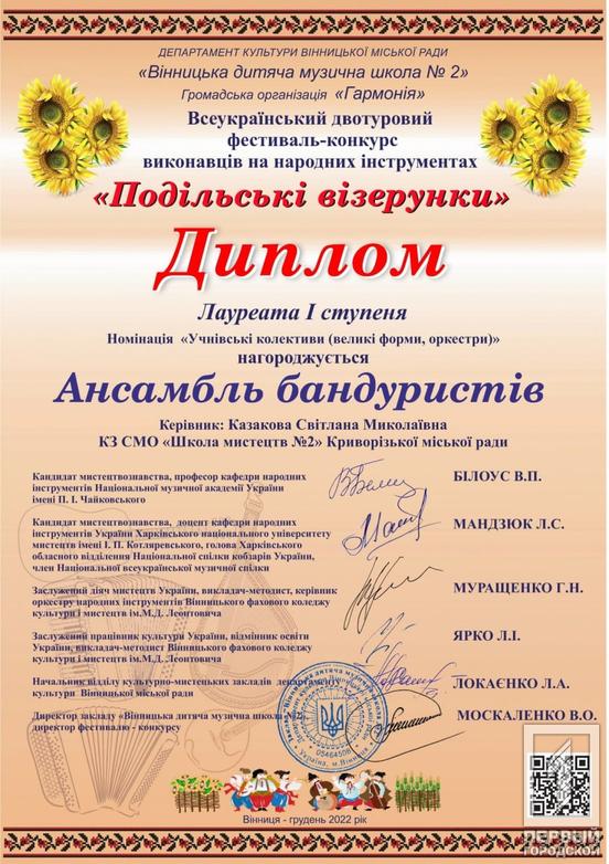 Поза тим, вдало себе продемонстрував і криворізький ансамбль бандуристів. Вихованці криворізької школи мистецтв №2 долучились до Всеукраїнського конкурсу виконавців на народних інструментах «Подільські візерунки». Таланти криворіжців високо оцінило професійне журі й призначило ансамблю бандуристів переможне І місце. Керівницею є Світлана Казакова.