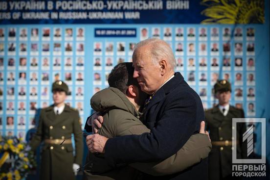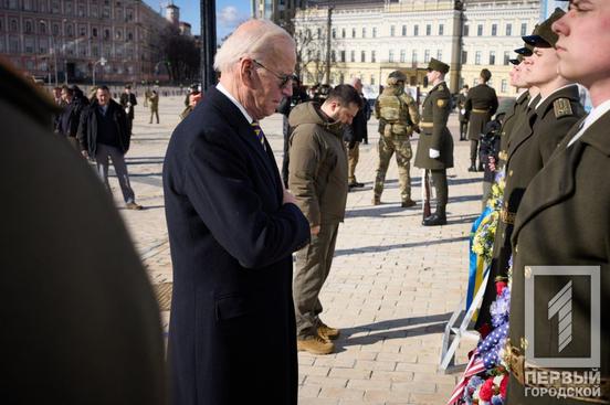 Байден та Зеленський відвідали Михайлівський Золотоверхий Собор у центрі столиці, вшанували пам’ять Героїв Небесної Сотні. Також В. Зеленський представив дошку, встановлену у Києві на Алеї Сміливості – дошку, присвячену величезній допомозі США Україні під час війни – дошку на честь Джо Байдена.
