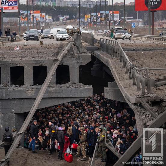 1. Українці зібралися під зруйнованим мостом, намагаючись врятуватися від російської окупації ‒ Еміліо Моренатті.