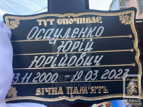25 березня в Інгулецькому районі прощалися із полеглим захисником України Юрієм Осауленком. Хлопцю було всього 22 роки. З дитинства він займався футболом. А коли вороги прийшли на нашу землю – вирішив змінити м'яч на військову справу. Захищав Україну у лавах 93-ї окремої механізованої бригади «Холодний Яр». Проявлена в боях звитяга дозволила ще зовсім молодому хлопцю стати командиром відділення. Разом із побратимами Юрій обороняв місто-фортецю Бахмут. 19 березня життя воїна обірвалося. Поховали хлопця на Алеї слави місцевого кладовища в селищі Широке.