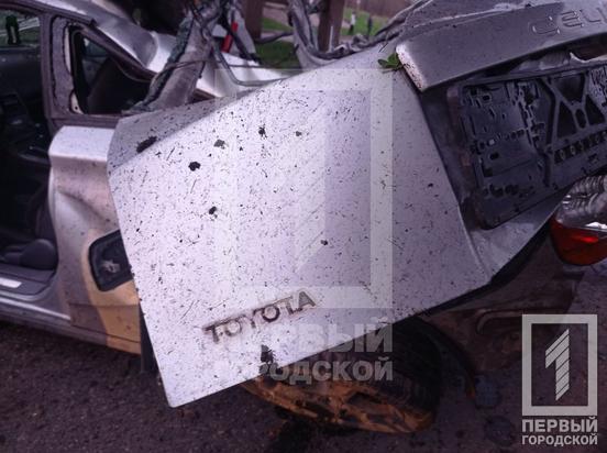 Легковик сильно розтрощило. Машина отримала сильні пошкодження різних частин кузову: у неї відірвало капот, зім’яло дах, задню частину, повилітало скло.