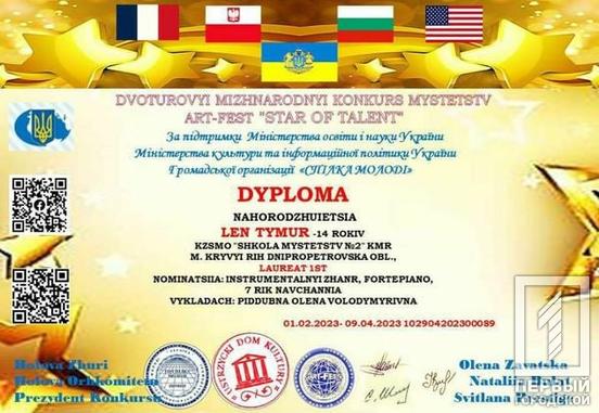 У квітні закінчився міжнародний конкурс мистецтв Star of talent, який одночасно проходив одразу у п’яти країнах Європи та світу. Кривий Ріг на конкурсі представляв вихованець фортепіанного відділу школи мистецтв №2 Тимур Лень, який здобув перемогу у своїй категорії. Про успіх свого учня школа повідомила на своїй сторінці в соцмережі.