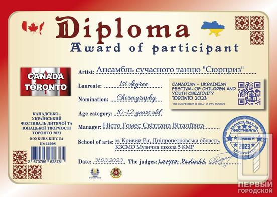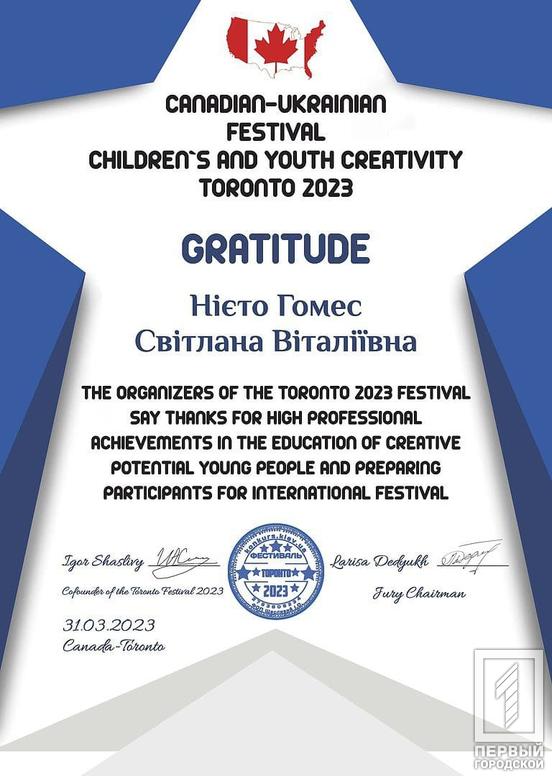 Вихованці Криворізької музичної школи №5 взяли участь у конкурсі «Торонто 2023» й здобули перемогу. Творчий ансамбль представив свій виступ на Міжнародному фестивалі дитячої та юнацької творчості. Про це стало відомо з соцмереж школи.