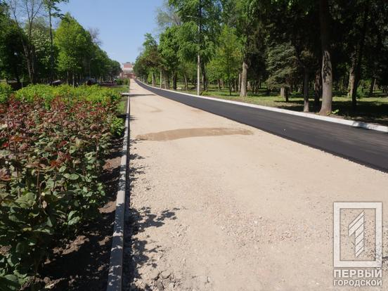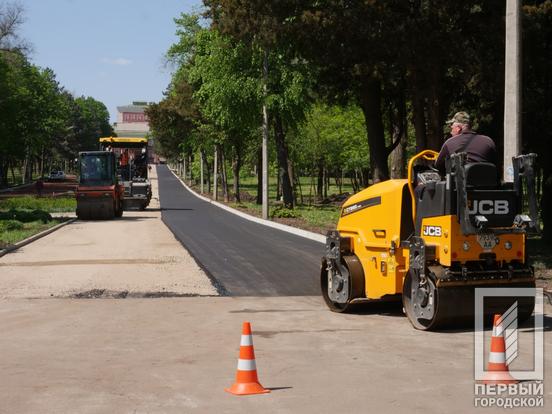 Буде відновлено асфальтне покриття алеї парку площею майже 9 тис. м2. Вже виконано зняття старого асфальтобетонного покриття за допомогою машини для холодного фрезерування. Будівельники вже замінили бордюрний камінь вздовж клумб та алеї, провели заміну оголовків та люків на колодязях інженерних мереж. Виконали ремонт зливової каналізації, з заміною мереж, що проходить під алеєю. На даний час завершуються роботи з асфальтування.