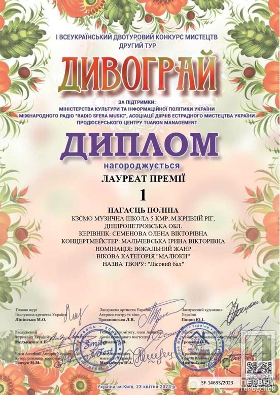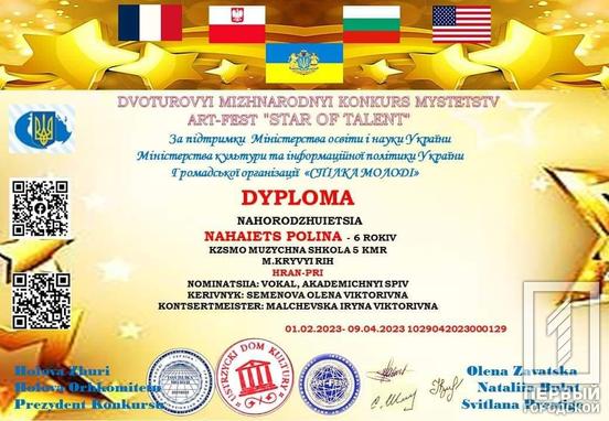 Вихованка криворізької музичної школи №5 Поліна Нагаєць взяла участь у міжнародному та всеукраїнському конкурсах мистецтв і посіла призові місця. Інформація про це з’явилася на сторінці навчального закладу у соцмережі.