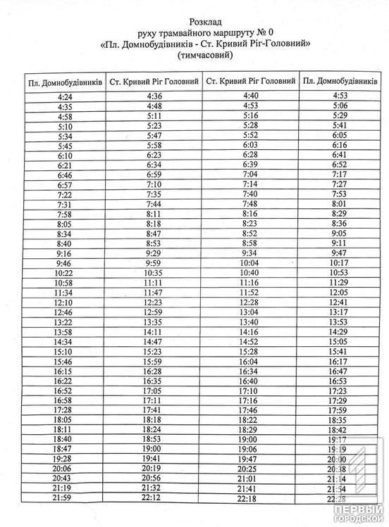 Тимчасовий маршрут працюватиме з 9:00 ранку 15 травня до 17:00 години 19 травня. А також відновить свою роботу на період з 9:00 ранку 22 травня до 17:00 години 23 травня. Найперший рейс маршруту стартуватиме о 4:24 з зупинки «Площа Домнобудівників», а зі станції Кривий Ріг-Головний – о 4:40. Останній за часом рейс відходить з площі о 21:59, а зі станції – о 22:18. Повністю ознайомитись із графіком трамвая №0 можна на фото.