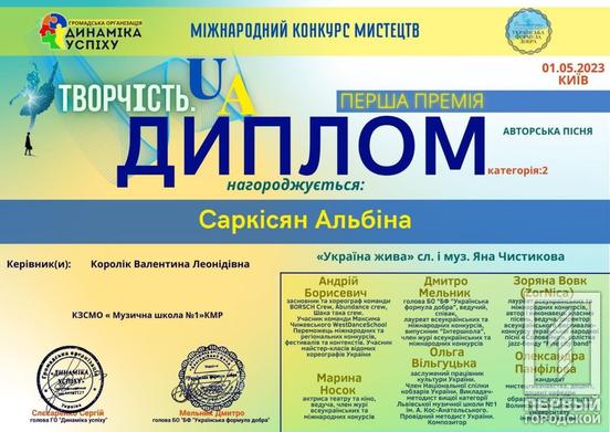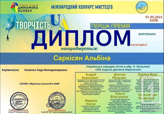 А багатогранна вихованка музичного навчального закладу Альбіна Саркісян виборола перемогу одразу у двох різних номінаціях. У дівчинки перша премія у номінаціях «Авторська пісня» та «Фортепіано». Вітаємо із гарним творчим здобутком переможницю і двох її викладачок Валентину Королік та Ладу Козенко.