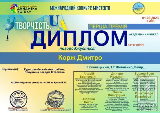 Кваліфіковане журі Міжнародного конкурсу мистецтв високо оцінило таланти криворізьких зірочок. У своїй віковій категорії учень музичної школи №1 Дмитро Корж переміг у номінації «Академічний вокал». Вітаємо переможця та його викладачку Євгенію Курасову із заслуженою нагородою.