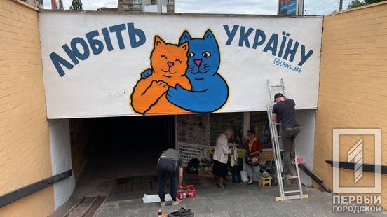 Можливо не всі містяни знають, але одне із найжвавіших місць Кривого Рогу – підземний перехід на 95-кварталі територіально належить до Саксаганського району. Щодня через нього проходять, без перебільшення, тисячі людей. Починаючи з 16 травня, усіх їх на вході зустрічатиме мурал із зображенням котиків з патріотичною символікою і посланнями.