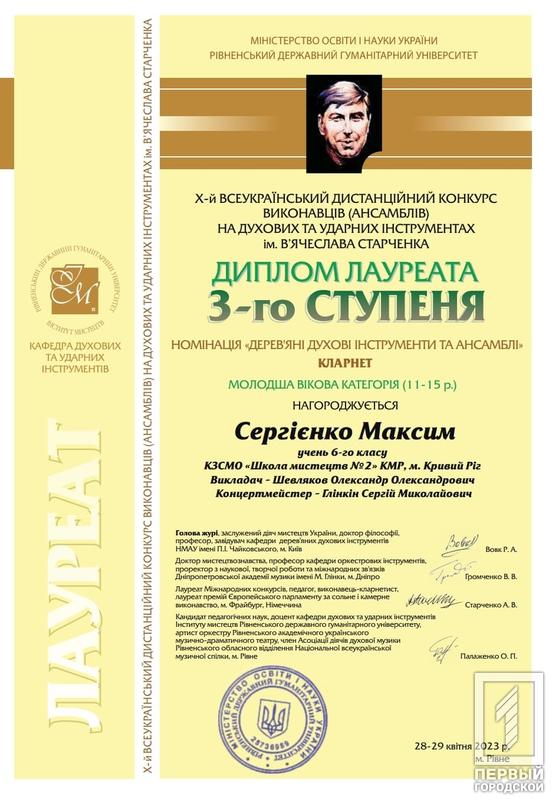 Третє місце заслужено отримали Максим Сергієнко та Уляна Масляна, їхні викладачі Шевляков Олександр Олександрович та Шевлякова Ксенія Романівна, разом з концертмейстрами Глінкіним Сергієм Миколайовичем та Глінкіною Сергієм Миколайовичем, допомогли їм розкрити таланти на повну.