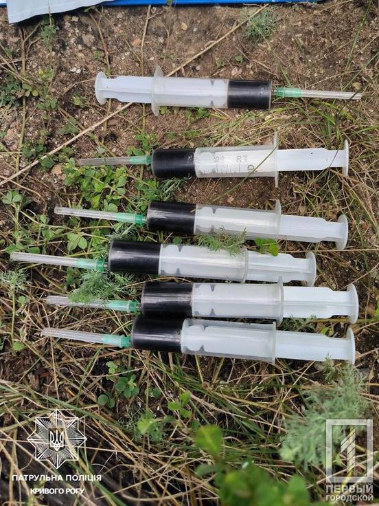 Поліцейські зупинили громадян та місце, звідки вони пішли. Там патрульні знайшли пакет, всередині якого були шість медичних шприців, наповнених наркотичною рідиною, ймовірно «ширкою».