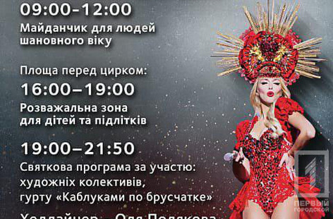 Возле ТЦ «Коопмаркет» с 18:00 до 20:05 криворожан ждут выступления коллективов ДК «ИнГОКа», победителя шоу «Голос Країни» Антона Копытина, а в 20:05 – участницы «Евровидения» Златы Огневич.