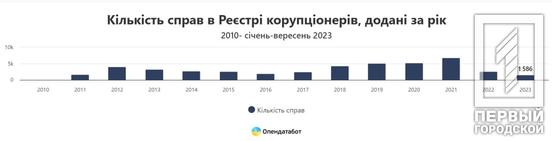 Реєстр зберігає інформацію з 2010 року. Проте, у вказаний час фіксувалося лише 9 корупційних оборудок. Повноцінно ресурс запрацював з 2011 року. Його активне поповнення почалося з 2018 року – кількість виявлених порушників стала більшою в 1,7 разів. Піковим і найбільш «плідним» вважається 2021 рік – 6 850 порушень. Це в 1,6 разів вище, ніж за 1,5 роки повномасштабної війни. За весь минулий рік було 2 585 справ, за 9 місяців 2023-го - ще плюс 1 586.