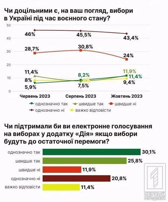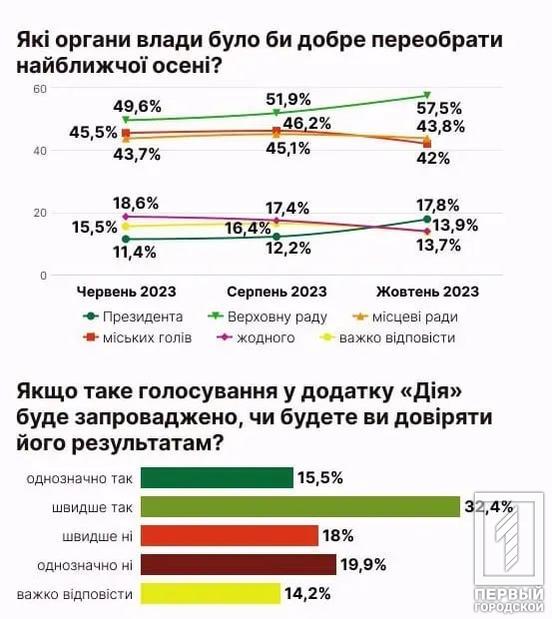 55,9% громадян вважають ідею голосування доцільною. Довіряти результатам через мобільну програму думають 47,9%. Що стосується того, кого б змінили люди, то ситуація виглядає у відсотках так: