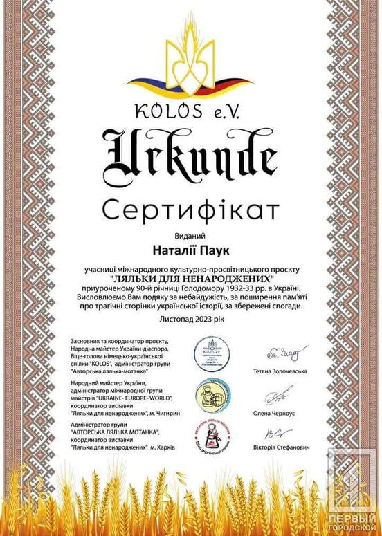 Криворіжанка Наталія Паук долучилася до Міжнародного культурно-просвітницького проекту «Ляльки для ненароджених». Він приурочений до роковин Голодомору 1932 – 1933 років. Про це повідомляють у ЦДЮТ «Сонях».