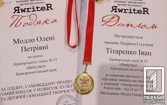 Одиннадцатиклассник з Криворізького ліцею № 35 «Імпульс» здобув перемогу на Всеукраїнському дистанційному конкурсі авторської прози та поезії «ЯwriteR». Професійне журі високо оцінило його есе та присудило перше місце. Про здобуток криворіжця повідомив департамент освіти і науки виконкому Криворізької міської ради.