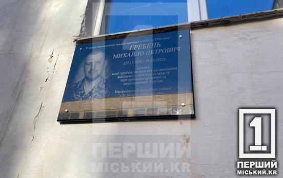 У Кривому Розі на базі гімназії №121 з’явилася пам’ятна дошка солдату ЗСУ Михайлу Гребеню. Герой отримав смертельне кульове поранення під час виконання бойового завдання в районі населеного пункту Новотошківка Луганської області.