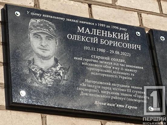 Перша дошка розповідає про Олексія Маленького. Захисник був веселим, добрим, щирим та життєрадісним. До кожного міг знайти підхід та розвеселити будь-кого. Мріяв жити вільно і справедливо. Він був водієм господарчого відділення взводу матеріального забезпечення. Життя військового обірвалося поблизу населеного пункту Ольгіне Херсонської області 29 серпня минулого року. Посмертно воїна відзначили нагрудним знаком «За заслуги перед містом» ІІІ ступеня та «Гордість Довгинцівського району».