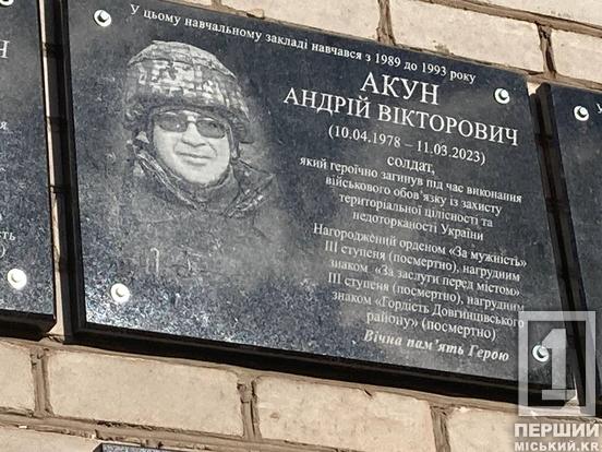 Другу дошку присвятили Андрій Акун був працьовитим, врівноваженим, опорою для батьків та підтримкою для дружини. Свій останній бій стрілець-сапер зустрів 10 березня в районі населеного пункту Часів Яр на Донеччині. Його відзначили орденом «За мужність», нагрудними знаками «За заслуги перед містом» ІІІ ступеня та «Гордість Довгинцівського району» – посмертно.