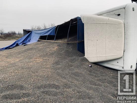 Великоваговик рухався з боку Новоіванівки. В момент виконання повороту у нього луснув скат. Тому машина перекинулася. У причепі було насіння соняшника. Воно прорвало тент та висипалося на дорогу. Також є пошкодження правого боку кабіни.