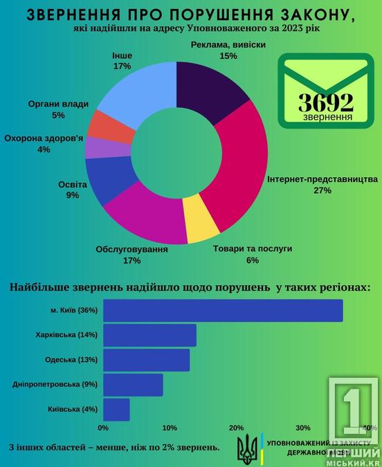 На адресу Уповноваженого із захисту державної мови за 2023 рік надійшло 3692 звернення громадян про порушення Закону України «Про забезпечення функціонування української мови як державної». Це найбільша кількість скарг за всі роки існування інституту Уповноваженого і на 30% більше, ніж у 2022 році, тоді їх було 2846.