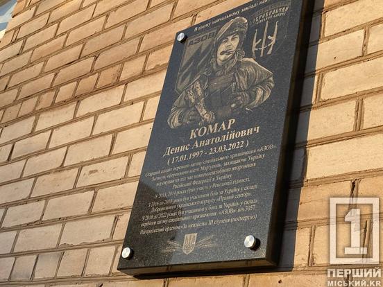 На фасаді Криворізького навчального комплексу №128 встановили пам’ятну дошку оборонцю Маріуполя, активісту і патріоту Денису Комару. Подвиг захисника буде увічнений, а містяни пам’ятатимуть ім'я ще одного воїна, якому ми завдячуємо свободою.