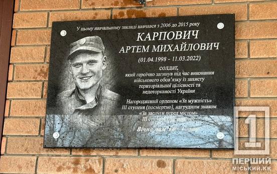 Нагадаємо, що у криворізькому ліцеї №49 відкрили меморіальну дошку на честь полеглого Героя Артема Карповича.