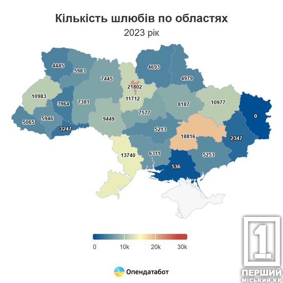 «Лідером за кількістю нових шлюбів у 2023 році став Київ — 21 802. Це на 14% менше, ніж у 2021 році. На другому місці Дніпропетровщина — 18 816 шлюбів. Замикає трійку лідерів Одещина — 13 740 нових сімей. Єдиним регіоном, де нових сімей на другий рік повномасштабної війни побільшало, стала Харківщина: 10 977 одружень або +11%.