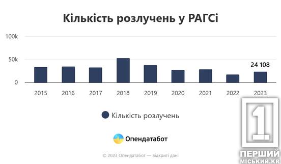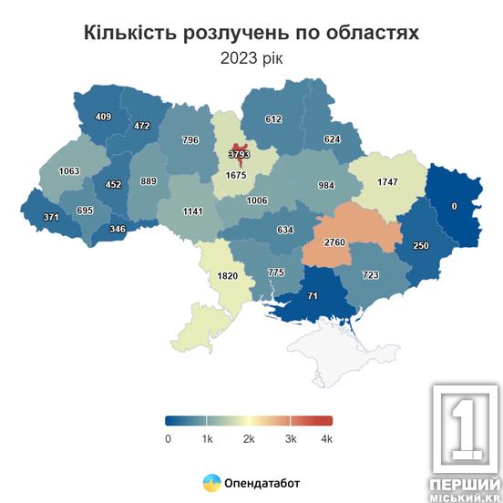 Є й статистика за розлученнями. Торік їх було 24 108. Але це менше на 18,5%, ніж було у 2021 році. Київ також за цим пунктом в лідерах – 3 793 розірвання шлюбу. На Дніпропетровщині у 2023-ому зафіксовано 2 760 розлучень.