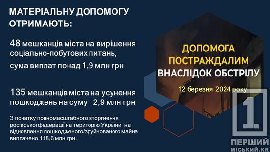 В.о. міського голови Юрій Вілкул зазначив: «На жаль, 12 березня внаслідок ракетної атаки загинули наші криворіжці, пошкоджені будинки, садки, школи, медзаклади. Місто з перших хвилин допомагає постраждалим. Одразу були розгорнуті штаби з допомоги мешканцям. Окрім будматеріалів, які місто видало для першочергового усунення наслідків, надана допомога з розселенням, люди були забезпечені й тимчасовим житлом, і харчуванням, і всім необхідним.. Також допомагали мешканцям у відновленні документів та в інших питаннях. І, звичайно, виплачуємо матеріальну допомогу на відновлення пошкодженого або зруйнованого житла. Наразі продовжуються обстеження та актування пошкоджених квартир у будинках, наші фахівці продовжують приймати заяви від мешканців міста на компенсацію витрат з ремонту пошкодженого житла.