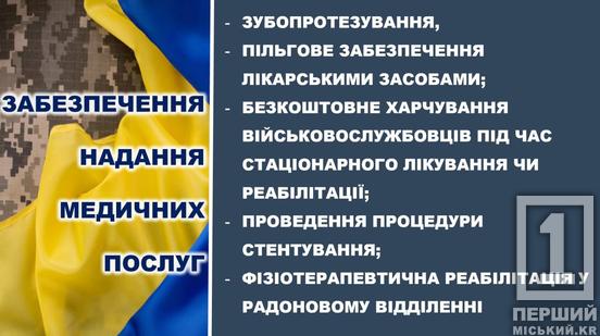Це і виплати матеріальноїдопомоги ветеранам та їх сім’ям, на 2024 рік передбачено 65 млн грн, вже профінансовано 38 млн грн. За рішенням Криворізької міської ради військовослужбовці звільнені від оплати з надання адміністративних послуг. Для ветеранів та військовослужбовців надається безкоштовне зубопротезуваннята харчування під час стаціонарного лікування чи реабілітації; за пільговими рецептами здійснюється забезпечення лікарськими засобами та інші медичні послуги. Особлива увага приділяється дітям, це і безкоштовне харчування у закладах дошкільної освіти окремої категорії дітей, забезпечення дітей безоплатним навчанням у комунальних закладах мистецької освіти, привітання діток новорічними подарунками та безоплатне оздоровлення дітей у заміському таборі. На знак пошани загиблих військових установлюються меморіальні дошки також проводиться реконструкція Меморіального бульвару «Алея Слави» на кладовищі «Центральне» та будівництво меморіального комплексу в секторі почесних похованькладовища «Центральне». Крім того, у місті розвивається ветеранський спорт. До занять спортом залучаються не лишеветерани, а і члени їх родин.