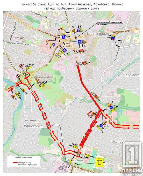 Перед початком виконання цих завдань на Кобилянського, Гетьманській, Каховській, Пісочній, Старовокзальній, Широківській, проспектах Миру та Центральному встановлять нові дорожні знаки, які відповідатимуть тимчасовій схемі організації курсування.