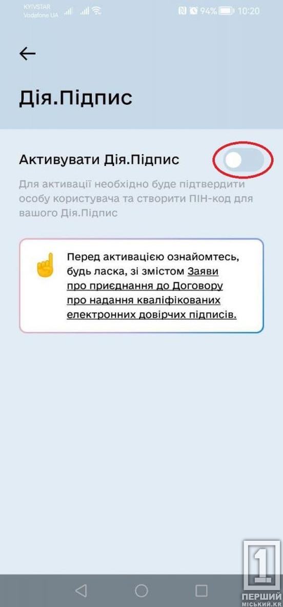 - Активація «Дія.Підпис» відбувається завдяки переведенню бігунка у крайнє праве положення.