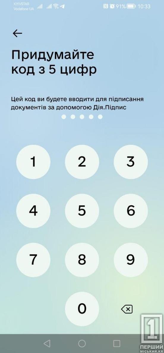 - Введіть п’ятизначний код для накладання «Дія.Підпису». Якщо ви використовуватимете його вперше, то запам’ятайте обов’язково комбінацію.