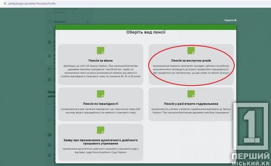 - Там де вид пенсії, слід клікнути на потрібний. До прикладу, «Пенсія за вислугу років».