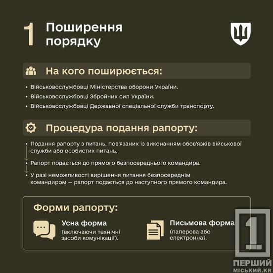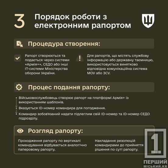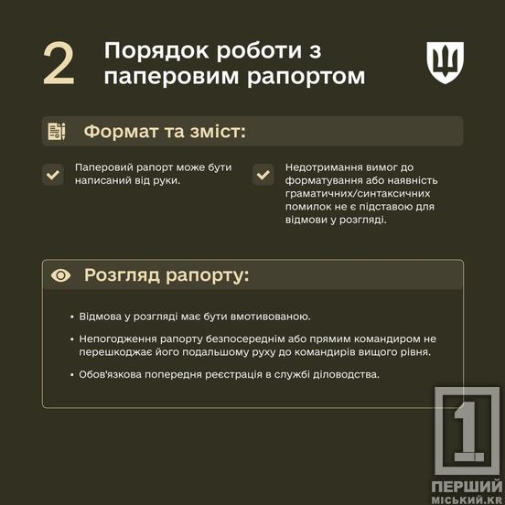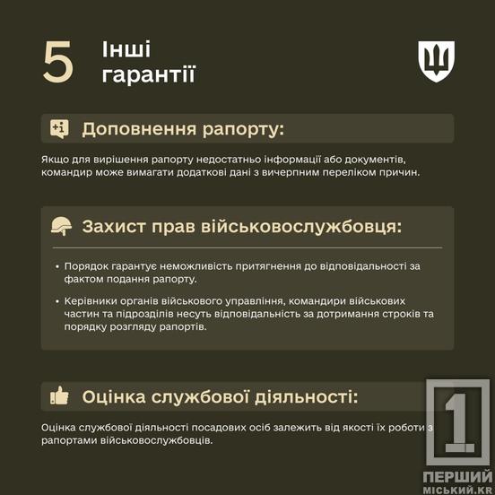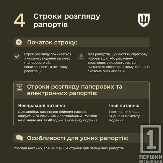 - Не пізніше 48 годин після подання гарантовано розгляд рапортів щодо військової дисципліни, бойових завдань, здоров’я особового складу та відпусток.